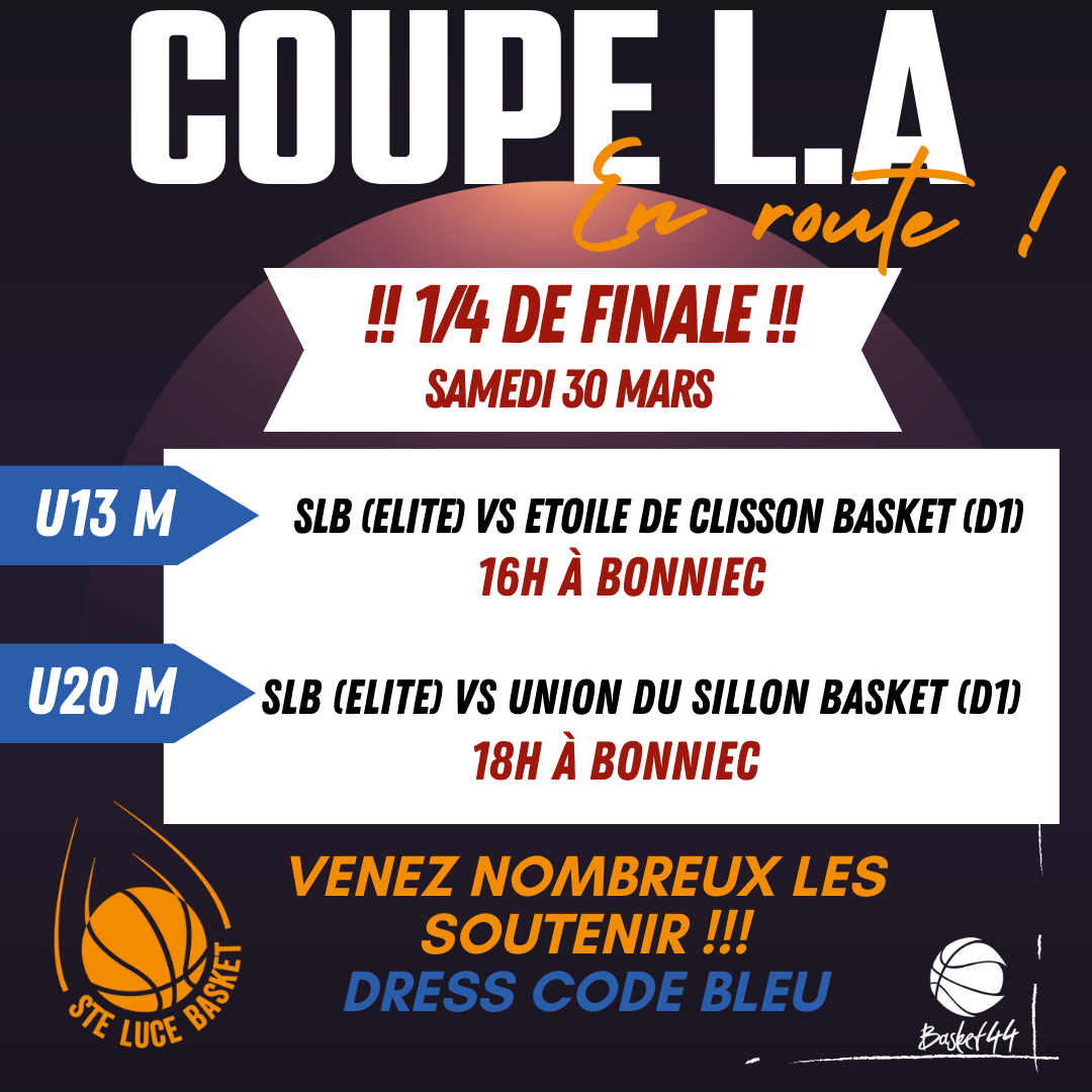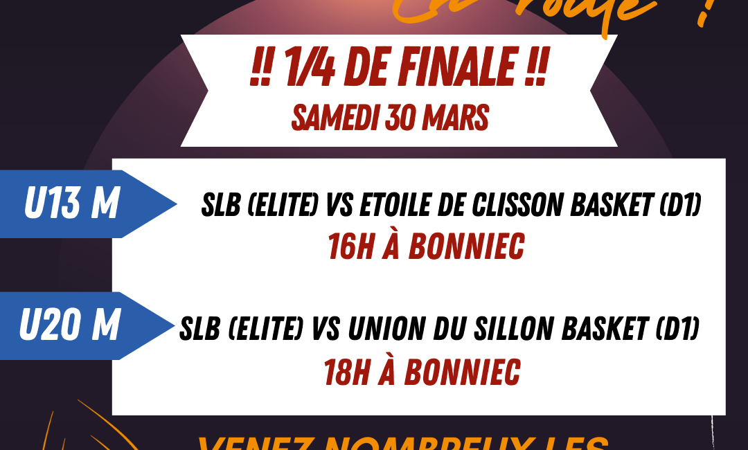 Toujours invaincu, nos U13M1 et U20M1 qui jouent en 1/4 de finale de la Coupe de Loire-Atlantique auront besoin de votre soutien, le samedi 30 mars 2024.