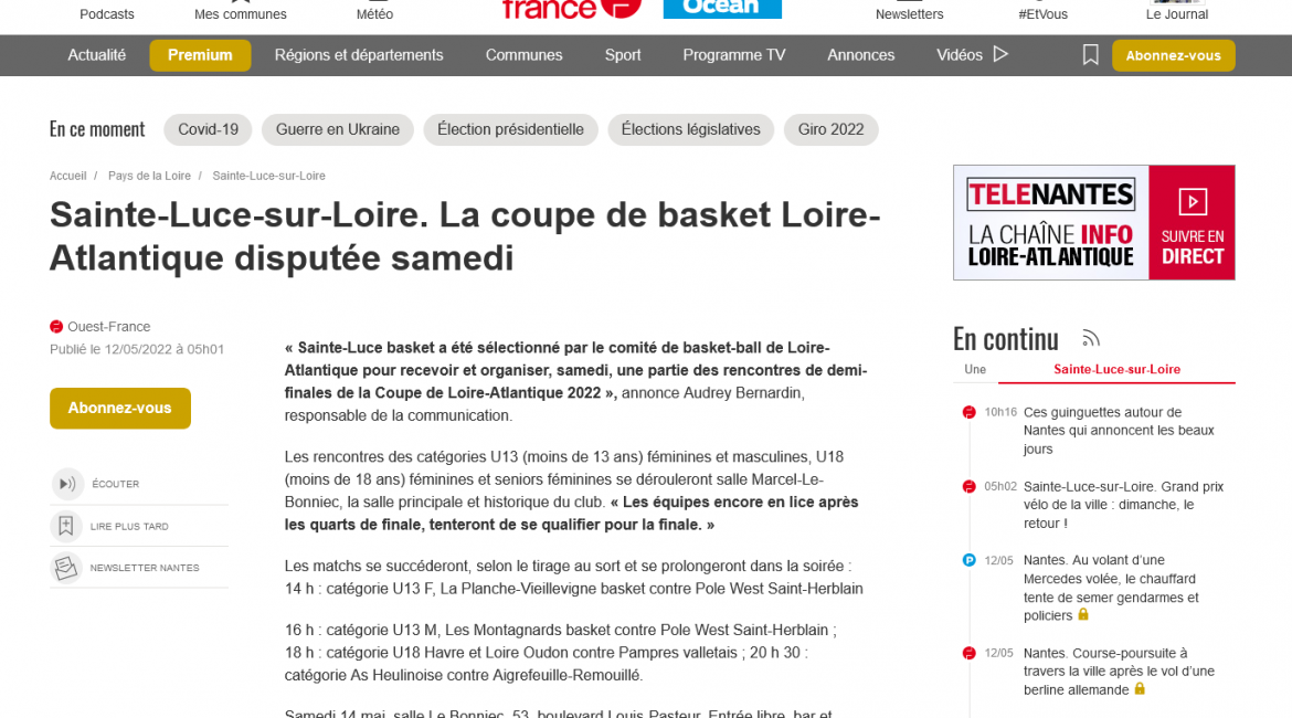 «Le Sainte-Luce basket a été sélectionné par le comité de basket-ball de Loire-Atlantique pour recevoir et organiser, samedi, une partie des rencontres de demi-finales de la Coupe de Loire-Atlantique 2022», annonce Audrey Bernardin, responsable de la communication.