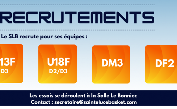 Le Sainte Luce Basket recrute dans plusieurs catégories : U13F - D3 U13M - D1/Élite...