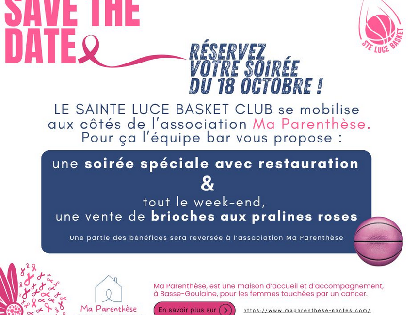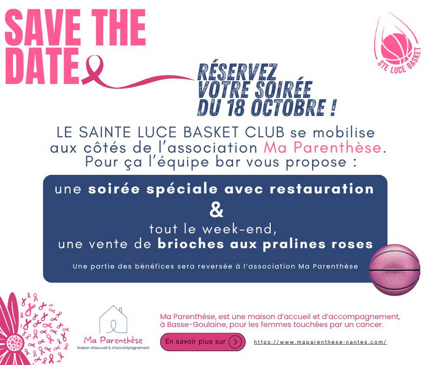 Octobre Rose est un moment fort de sensibilisation et de solidarité, et cette année, le Sainte Luce Basket s’engage aux côtés de l’association Ma Parenthèse pour soutenir la lutte contre le cancer du sein.