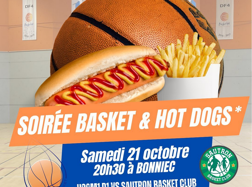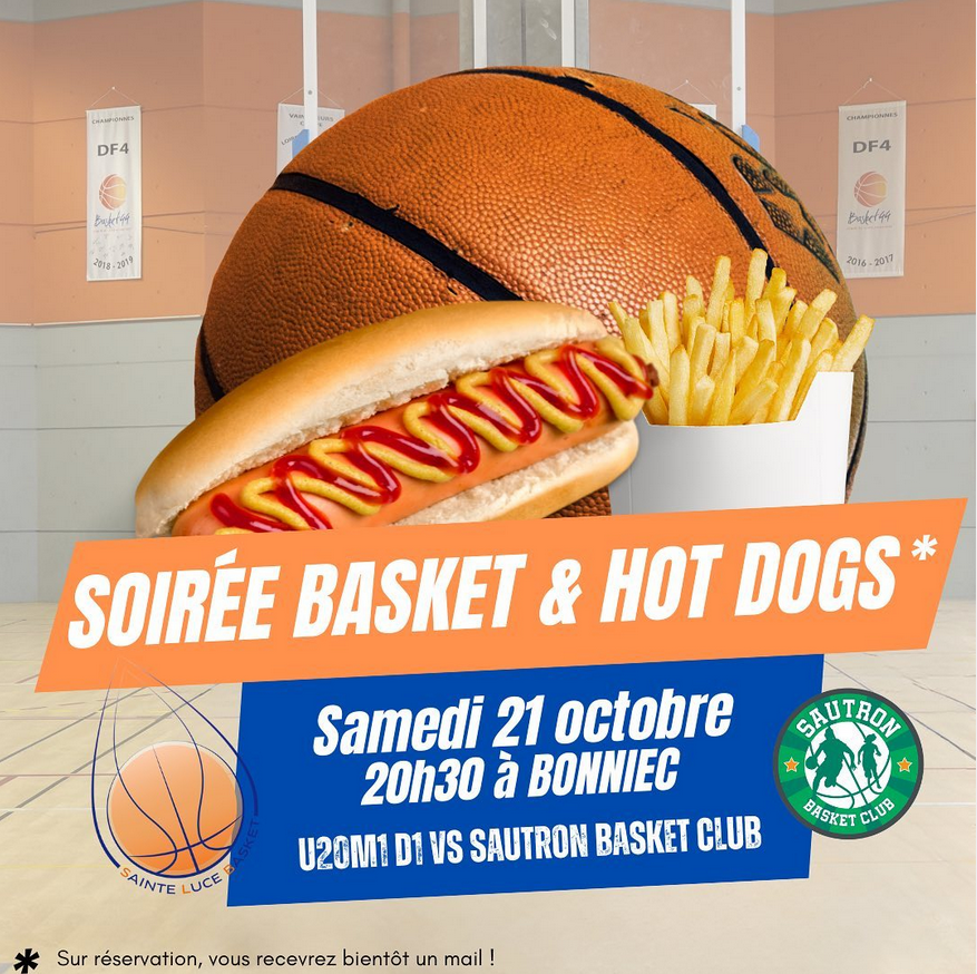 Samedi 21 octobre à l’occasion de la rencontre de nos U20M1 face au Sautron Basket Club, le Sainte Luce Basket organise une soirée Hot-Dogs à la Salle Marcel le Bonniec.